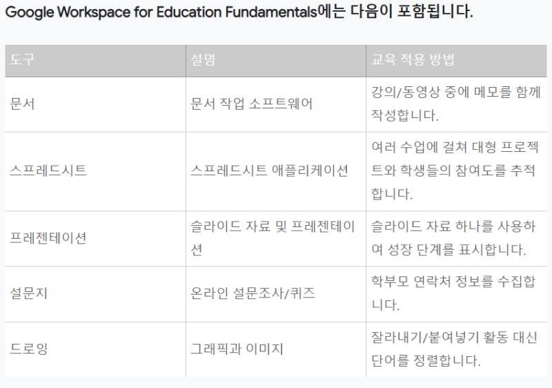 클래스룸, G메일, 구글 폼, 구글 문서, 캘린더, 구글 미트 등