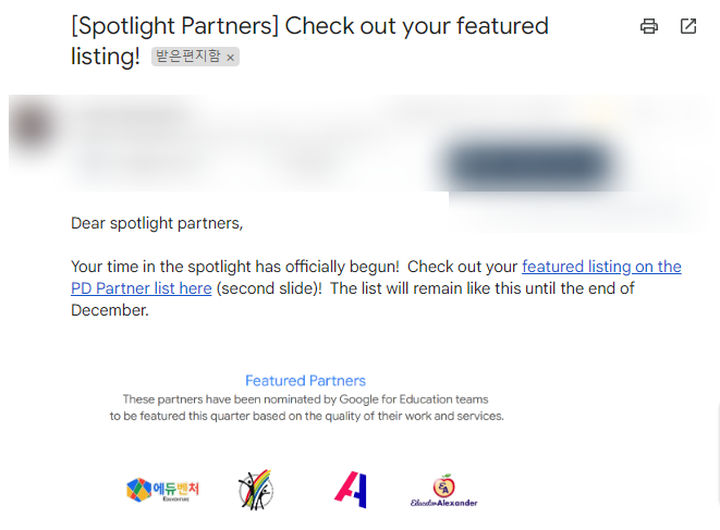 지난 9월 28일, 구글 파트너 담당자로부터 메일을 받았습니다. 다음과 같이 구글의 스팟라이트 파트너로 등록되어 12월말까지 게시될거라구요.